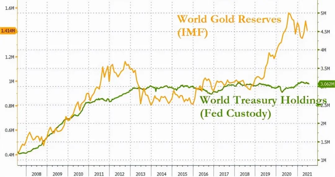 比如,日本央行在最近的11个月里有8个月是在出售美债,甚至,一支注册在日本的全球最大养老基金也在上周宣布将出售其34%仓位的美债,而俄罗斯更是在三周前宣布已经从其国家财富基金中完全剔除了美元,并用黄金等资产取代美元份额。