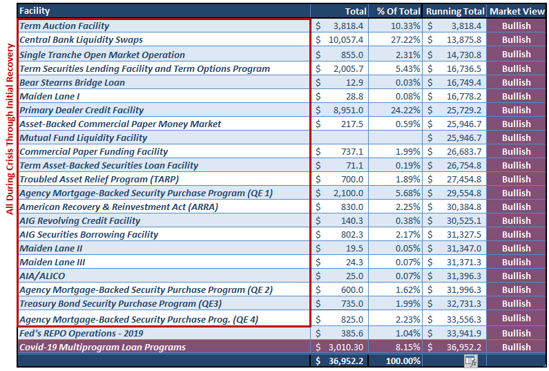 据BWC中文网国际财经团队持续统计,美联储的救助和刺激计划始于2008年,当时美国爆发次贷危机,从那以后他们就没有停止过,迄今为止,美联储和美国财政部已经向金融市场和经济主体中注入了36万亿美元的债务和流动性(具体细节请参考下图)。最新数据显示,美联储资产负债表规模目前约为国内生产总值(GDP)的40%。目前,美联储的资产负债表已经快速扩张到了8.35万亿美元。
