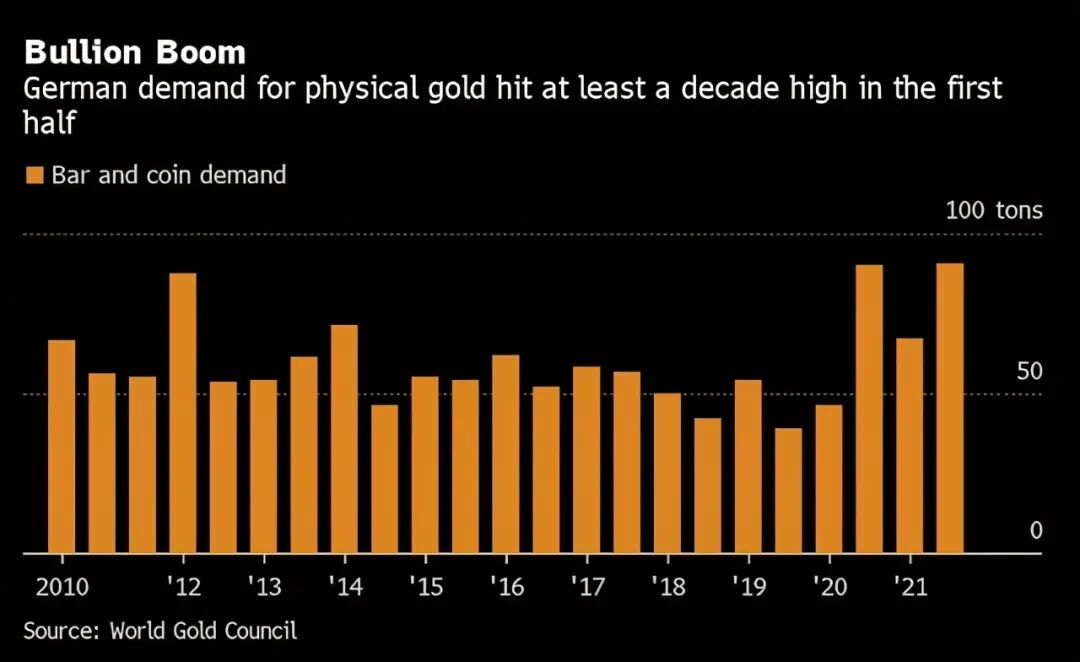 而事情的一个新变化是,世界黄金协会9月发布的最新报告显示,德国对黄金的需求量在2021年上半年达到了十年多以来(至少是2009年以来)的最高水平。此外,截止7月的6个月内,德国对黄金的需求比上二个季度增长了35%,而世界其它地区的平均水平则只有20%,德国是仅次于美国的第二大黄金储备国。