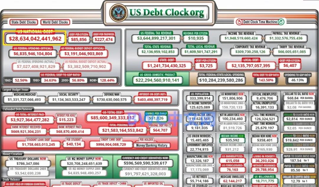 目前,美国国债时钟上显示的债务已经接近29万亿美元大关,根据美联储在9月6日公布的最新编制的报告显示,美国金融体系的债务已经达到90万亿美元。