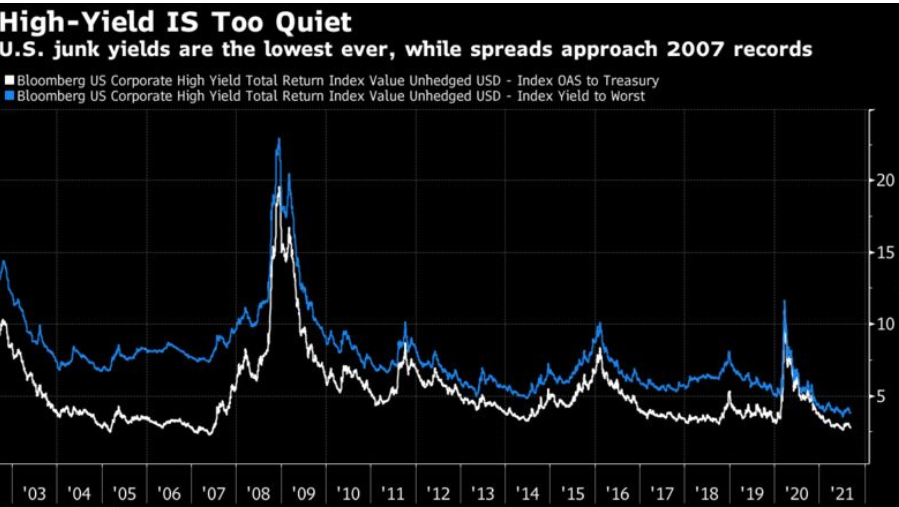 与此同时,由于美国经济此时已深陷债务困境之中,并且还需要向全球大量举债,因此,维系包括黄金,美债在内的一系列货币管理及偿还信用也十分必要。否则美国债务经济模式或难以持续。亿万富翁吉姆.罗杰斯几乎一语道破了美国债务经济模式的被动之处,他前不久表示,美国是全球最大的债务国,债务无处不在,这迟早都是要为之付出代价的。的确,正如2008年美国金融危机正是由次贷危机的债务困境所引发。而最新的迹象表明,眼下的一些情形与当年有相似之处。事情的一个新进展是,彭博社9月9日报道,当前美国市场最值得关注的地方是信贷市场,如下这张图表显示了美国企业收益率指数,该指数今年处于历史最低水平,与国债相比的利差正在逼近2007年夏天,也就是美国次贷危机前夕创下的历史最低水平。从这一角度来讲,一场潜在的次贷危机或正在美国市场酝酿。不过,美媒称,这仅仅是美国垃圾债券市场的一个缩影。