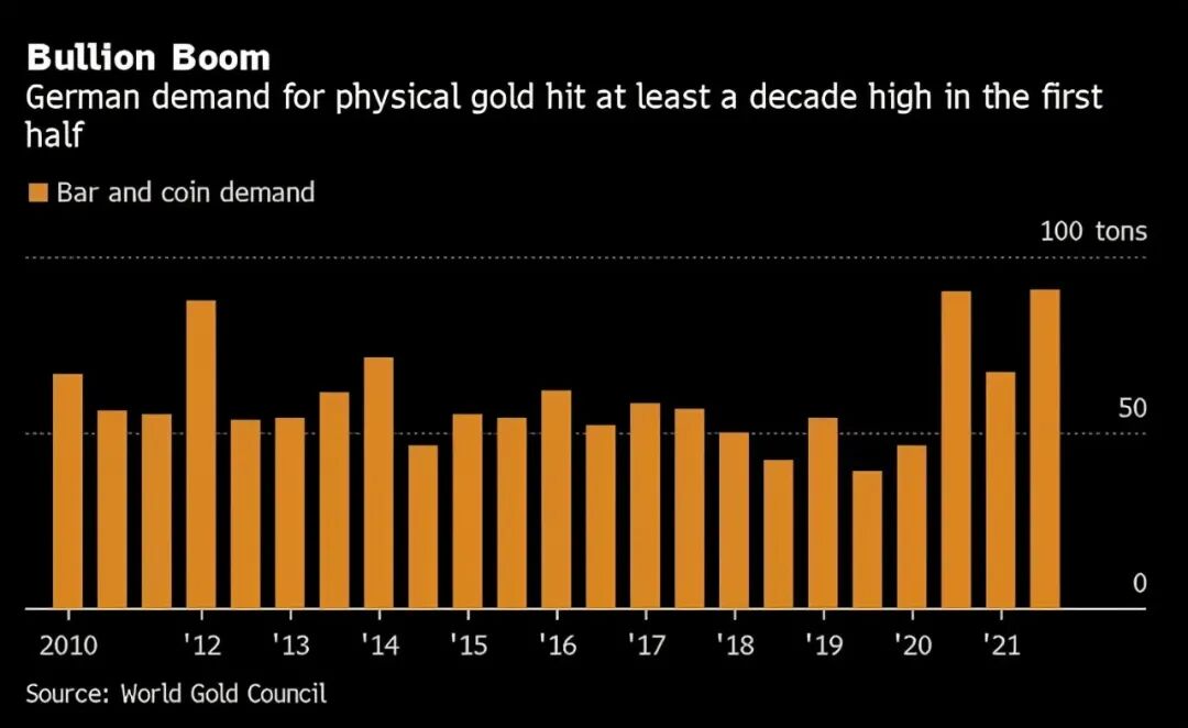 而事情的另一个新进展是,世界黄金协会最新数据显示,作为欧洲最大黄金买家的德国在上半年对黄金的需求比上二个季度增长了35%,远高世界其它地区20%的水平,创下了十年以来的最高纪录。也就是说,德国人对黄金的重视程度日益增加。