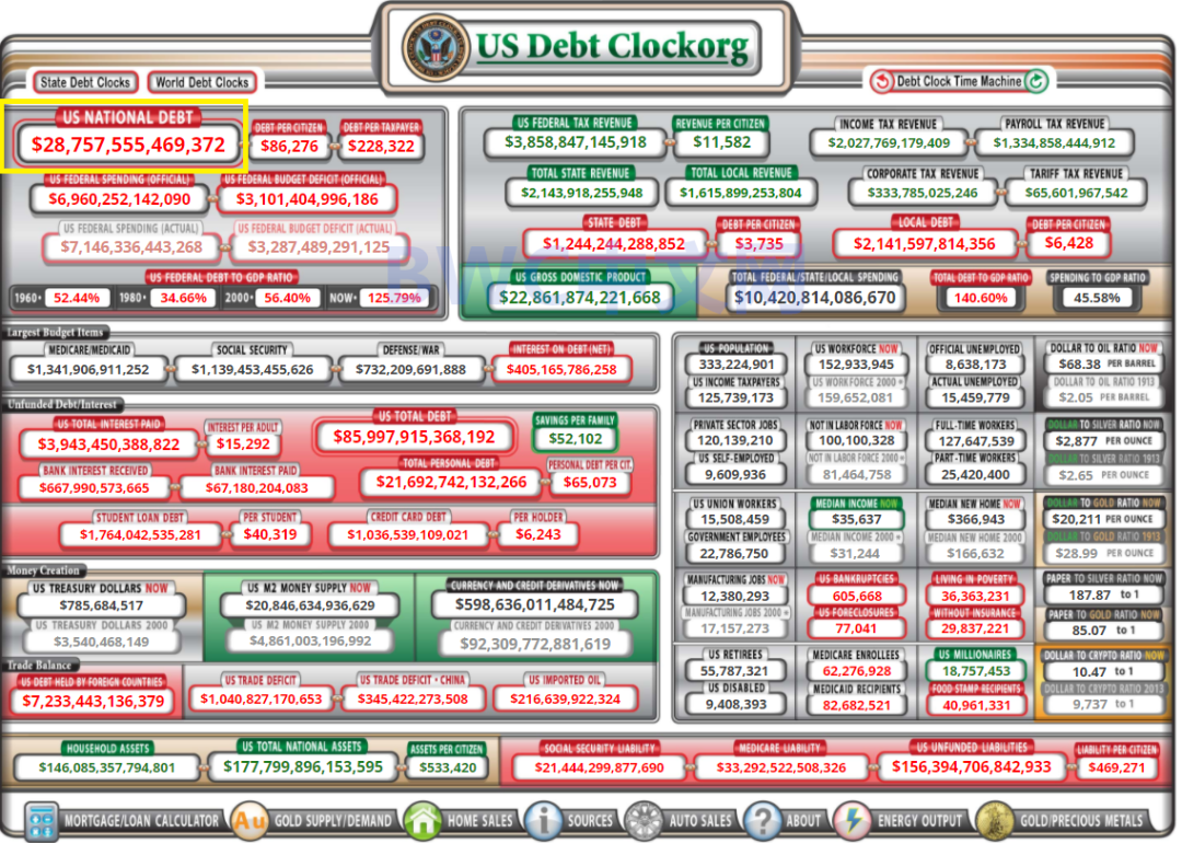 不仅如此,截至9月14日,在下面这个像飞机仪表盘样的美国联邦国债实时钟上显示的债务总额已蹿升至28.76万亿美元的历史极值。与此同时,美联储的资产负债表已经高达8.3万亿美元的新高。德意志银行表示,美联储如果按照目前的速度印钞,到2028年,资产负债表将从现在的水平扩张至20万亿美元。