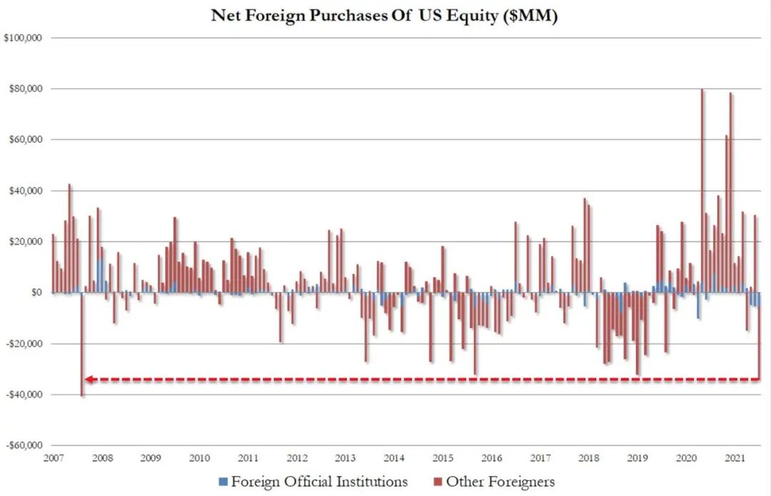 据美国财政部在9月17日最新公布的国际资本流动报告显示(美债官方数据有两个月的延迟惯例),2021年7月,外国私人投资者以2007年美股崩盘以来罕见的力度大幅度地抛售了343亿美元美股,创下14年以来的第二大月度抛售规模。