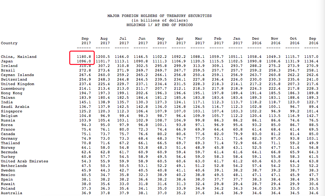 美国财政部动报告显示,截止7月的一年内,包括英国、日本、沙特等美国经济盟友及中国、俄罗斯、土耳其、巴西、法国、印度、比利时、加拿大、德国、泰国及瑞士等在内的央行级别的主要买家一直在持续减持美债,并没有追随自去年3月以来美债规模激增而相应地增加购债的比例,比如,2017年8月,中国所持美债仓位为1.20万亿美元,而目前已经降至1.068万亿美元(具体数据请参考下图)。