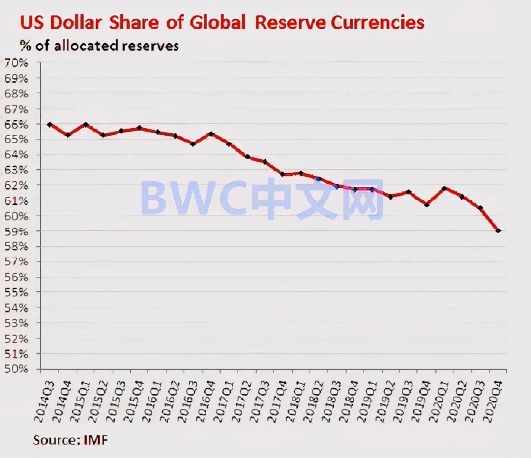 实际上,在美国经济这场世纪性大印钞的过程中,美元储备地位正在发生历史性地降低。如下图,据IMF稍早前公布的一组数据,美元份额已经意外地从2000年时的73%下跌至至59%的新低。与此同时,全球央行正不断用黄金等非美元货币替代美元储备的地位。