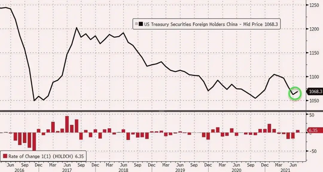值得一提的是,据美国财政部9月16公布的最新一期国际资本流动报告TIC报告数据显示,在2021年3月至6月,中国在4个月内连续累计减持423亿美债。自2017年以来,已经累计抛售了规模约2000亿美元的美国国债,综合美财政部的报告来看,中国抛售美债的总量最为显著。而事情的新变化是,7月,中国净购买了63.5亿美元的美国国债,持仓为1.0683万亿美元,打破了连续4个月抛售美债的状态。