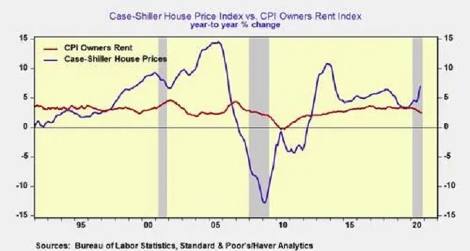这也使得全美国的平均房价目前正以美联储自身通胀目标的三倍上涨(增长了至少6%),房价通胀并未显示在居民消费价格指数(CPI)中,因为它使用非市场租金指数来捕捉房屋通胀的趋势。劳工统计局估计,过去12个月的非市场租金指数上涨了2.5%,比房价上涨低了450个基点,如果用实际房价代替租金,那么核心CPI在过去一年中将增长3%,几乎是1.6%的两倍,这将对美国经济产生不利的影响,特别是新冠状病毒还在美国持续蔓延,宽松的货币政策不能退出的背景下。