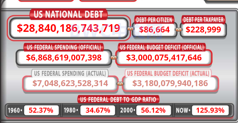 截至10月5日,美国联邦债务总额已经高达28.8万亿美元的历史最高水平,达到美国GDP的约126%。每个美国公民为此背负86,664美元债务,每个美国纳税人为此背负228,999美元债务。