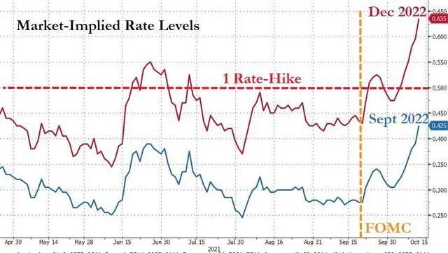 与此同时,在美联储9月的决策会议上,委员会一致投票决定将央行的基准短期借款利率维持在 0至0.25%。不过,市场的明年加息预期强劲,预计明年9月加息的几率高达90%。而这背后正是对美国通胀或将面临失控的再度担忧。