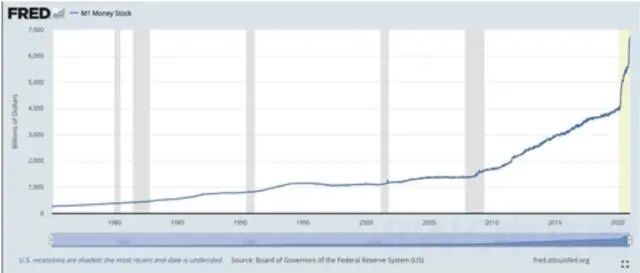 而下一张直接来自美联储的图表则显示了M1的绝对值增长方式…