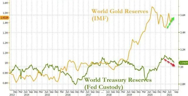 此消彼长,据世界黄金协会在10月15日公布的最新数据,今年前8个月,全球央行官方黄金储备净增加391.5吨,比最近五年同期分别增高39%,该协会的调查显示,21%的全球央行预计将在2022年继续购金,甚至,俄罗斯的国家财富基金中已经在三周前全部清除了美元份额,以置换黄金等非美元储备资产,这在美债价格大跌和美元储备份额开始下降的环境下料将变得明确。