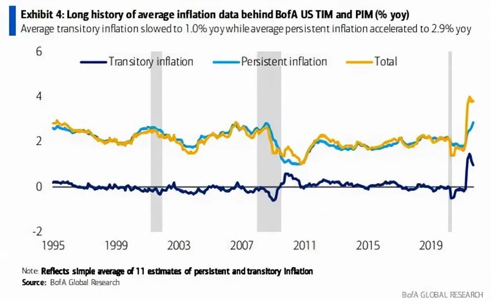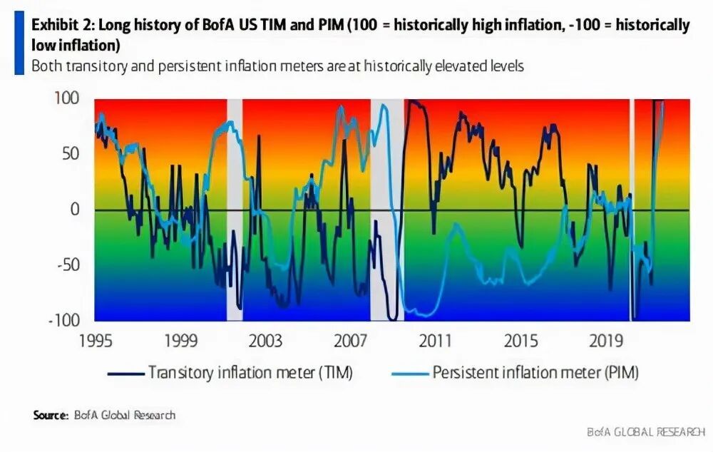 美国银行最新公布的“长期通胀指标”已接近爆表,并且前所未有。如下图,这一指标在历史上(只能追溯到1995年),临时和非临时通胀读数从未同时处于历史高位。这进一步表明,美联储通胀“暂时论”似乎站不住脚。而就在这个时候,美联储前主席格林斯潘也驳斥了美联储的通胀“暂时论”观点。