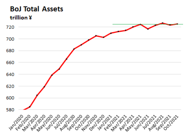 根据日本央行10月31日最新公布的最新数据,该央行的资产负债表总额为725万亿日元(6.36 万亿美元)。