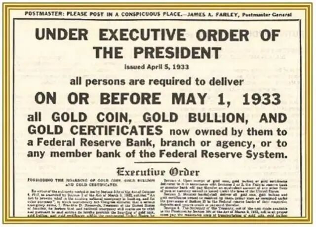 正如BWC中文网财经团队找到的这张报纸上所显示的那样(具体细节请参考上图),1933 年,出于种种原因,时任罗斯福总统通过臭名昭著的行政命令中明确禁止私人持有黄金,“没收”了美国人的黄金(请参考下图),长话短说,美国公民被要求上交他们的金币,作为回报,他们将在银行存入一笔存款,或者更有可能的是,将获得每盎司20.67美元作为交换回报。