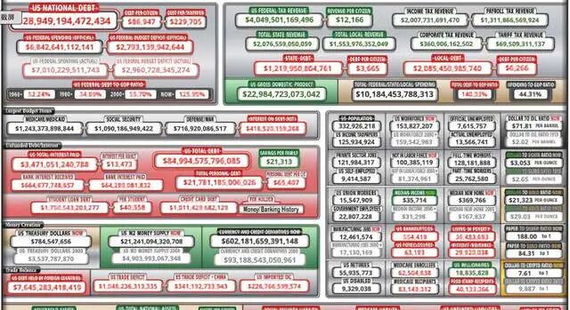 11月8日,在下面这个像飞机仪表盘样的美国联邦国债实时钟上显示的联邦债务赤字总额已经连跳三级即将触及29万亿美元大关,且数据还在不断增长中,简单的计算表明,美国人均欠债约9万美元,且随着美国债务上限违约风险增加。