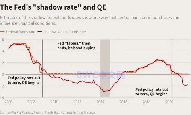 虽然,由于美国经济的持续增长,部分市场人士已经不再预测美联储会采取负利率的可能性,但有分析认为,在不可知因素突然中断经济复苏预期下,美联储可能在未来某个时候立即改变主意,从而支持负利率,因为,美联储的最新利率会议中再次把利率降至接近零的水平,甚至在三周前,联邦基金期货的市场数据表示,从2021年10月开始,美联储基准利率可能会跌至略低于零的水平。正如路透社监测到数据显示,目前,实际影子利率处于负值区间(具体数据趋势请参考下图)。