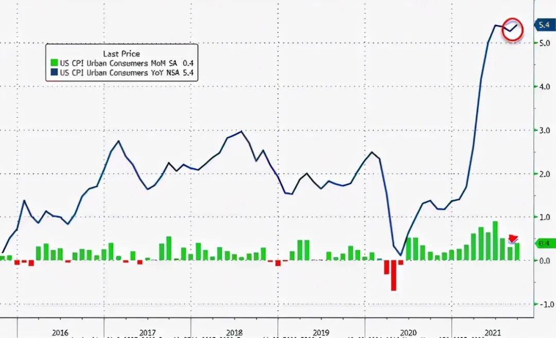 纽约联储在11月9日发布的调查显示,美国消费者通胀预期10月再创历史新高。交易员的通胀忧虑也在升高,30年期通胀保值国债收益率跌至纪录低点。经济学家预计,将于11月10日公布的美国劳工部报告将显示,截至10月份的12个月里,消费者价格指数(CPI)上涨5.8%,这将是CPI同比涨幅连续第五个月超过5%。