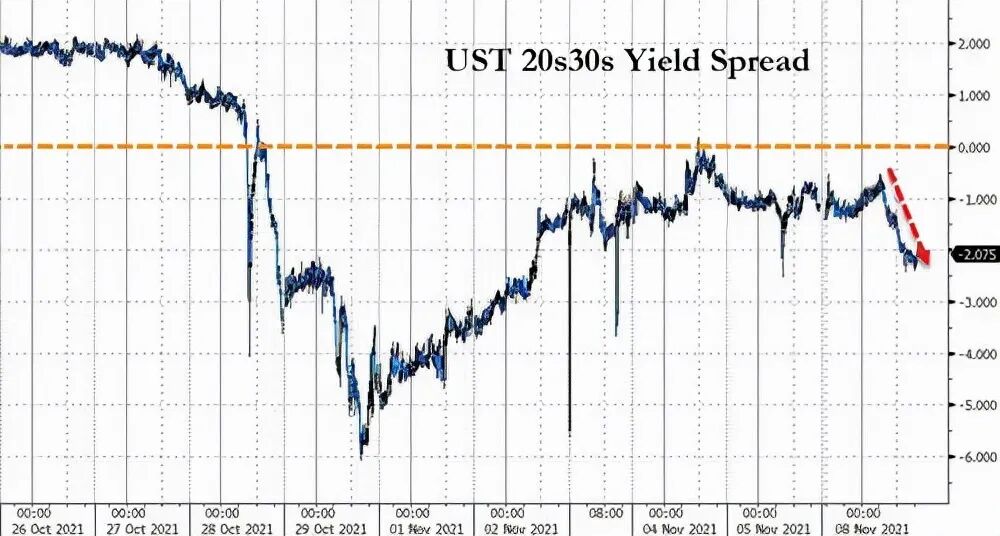 11月8日,美国20年-30年国债收益率曲线出现倒挂,这是美国财政部在2020年再度推出20年期国债以来首次出现这种现象。收益率曲线倒挂,会令市场感到“有些紧张”,我们注意到,目前,美债曲线的长端继续倒挂,这是该曲线连续第8天倒挂。