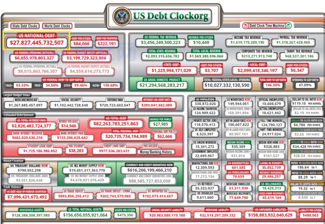 如下图,这个密密麻麻,像蜘蛛网一样的美国国债时钟上每一秒钟的变化,都是在提醒美国人:美国经济一直处于欠债的状态。截至1月24日,美国联邦债务总额高达约28万亿美元。过去四年间,这一数字增加了8万亿美元,美国债务总额轻松实现三级跳。