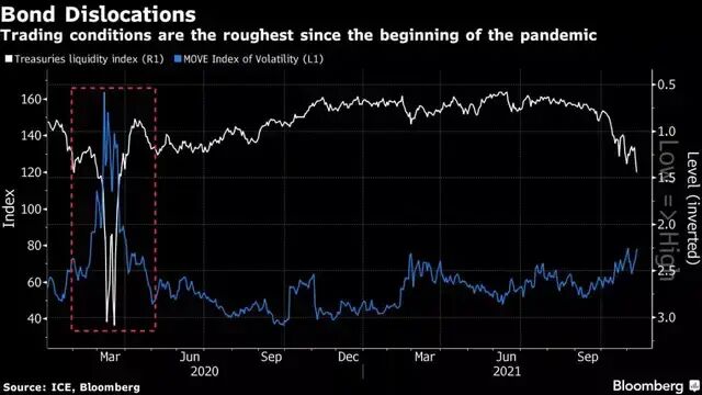 彭博社在11月12日监测到的数据显示,据彭博美国国家证券流动性指数显示,美债目前的交易状况为2020年3月以来最糟,至于预期波动率,跟踪美国国债的ICE美国银行MOVE指数目前接近2020年4月以来最高水平。