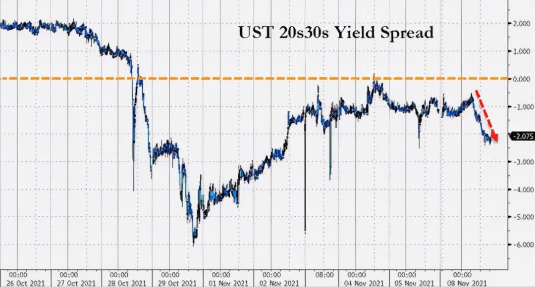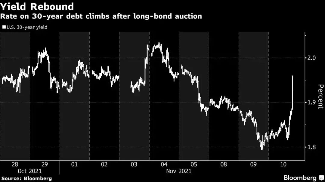 正如下图数据所示,美债目前的交易状况为2020年3月以来最糟。据彭博社在11月11日监测到的数据显示,当天发行的30年期美债中标收益率比发行前交易高出5个基点以上,这加剧了美债的回调,长期美债收益率持续攀升(债券价格与收益率成反比)。
