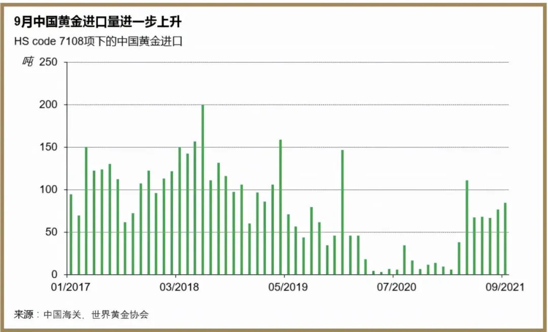 该协会发布数据还显示,9月和8月中国的黄金进口量分别为85吨和76.9吨,7月为67吨,这也使得中国在2021年3月至9月的总进口量达到513吨,同比去年增加达225吨。