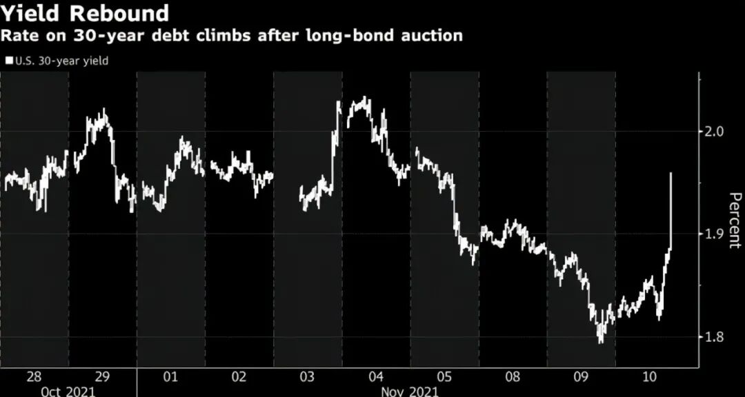 据路透社在11月16日援引的数据,美国财政部在11月11日和10月27日举行的两次美债拍卖发行结果不佳(2年期和5年期限的美债拍卖均出现滞销),比如,一支美国财政部拍卖610亿美元5年期国债,得标利率1.157%,投标倍数1.55,预发行交易利率为1.182%,上月投标倍数为2.37(具体细节趋势请参考下图)。