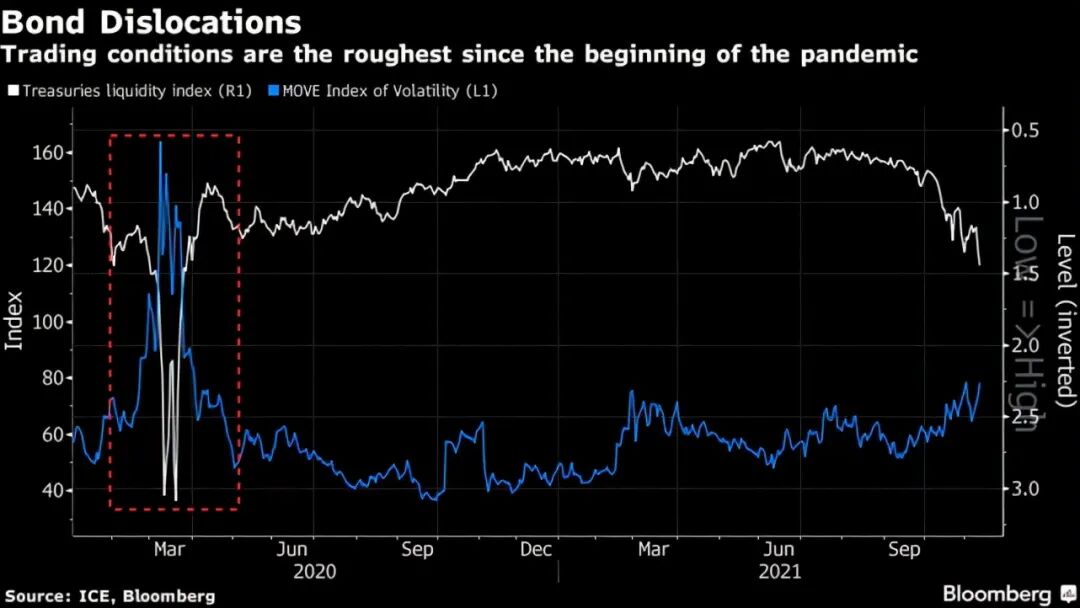 据彭博社在11月12日监测到的彭博美国国家证券流动性指数显示,美债目前的交易状况为2020年3月以来最糟,跟踪美国国债的ICE美国银行MOVE指数目前接近2020年4月以来最高水平,这也使得美国国债市场过去一个多月已成为雷区,遍布地雷,美债市场遭遇2月以来最大抛盘。