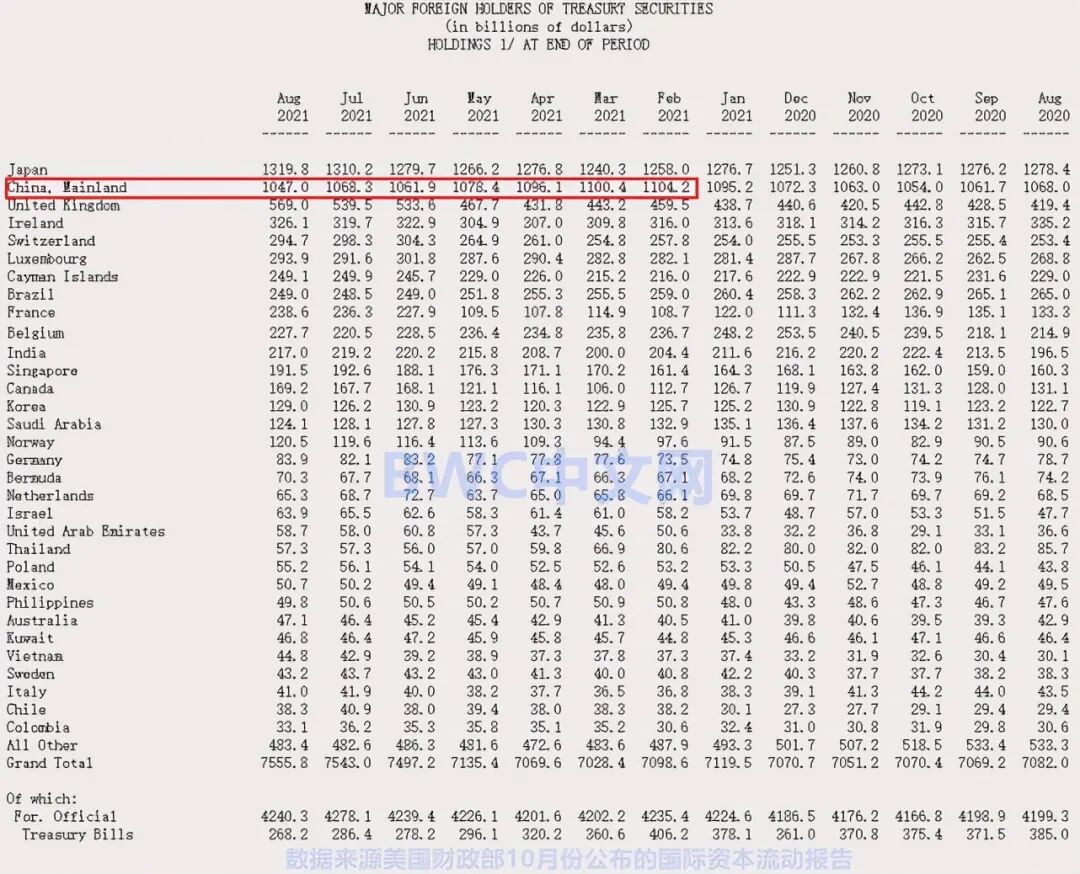 但现在,包括德国、法国、英国、日本、沙特在内的美国传统盟友在内的海外美债持有者,对美债的需求已经开始出现下降趋势,并没有追随自2020年3月以来美债规模激增而相应地增加购债的比例(具体数据趋势请参考下面这张美国财政部最新公布的数据图表)。