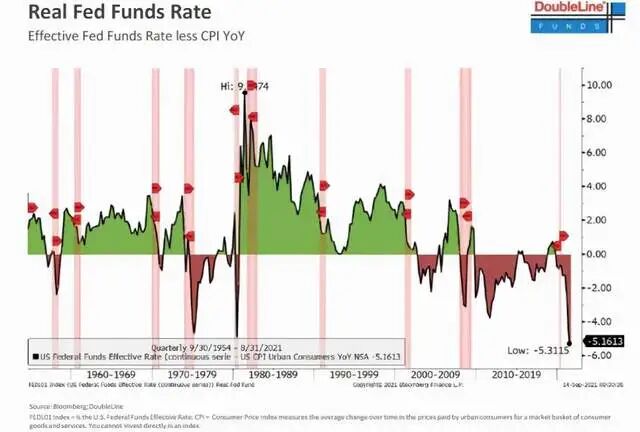 正如下图所示,随着美联储资产负债表的大规模扩张(以及随之而来的利率操纵),实际联邦基金利率显着为负(美国上一次出现如此大规模的负利率不是因为利率低,而是因为通货膨胀高)。
