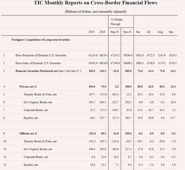 据美国财政部在11月17日公布的国际资本流动报告显示,9月份海外持有的美债降至7.549万亿美元,全球央行连续第五个月净抛售了高达340亿美元的美债,比如,日本9月所持美国国债大幅减少了202亿美元(约合计1290亿人民币),至1.3万亿美元,这也是自2019 9月以来最大的月度抛售。报告显示,9月份,包括私人投资者、全球央行级别的投资者在内的总资金共出现了535亿美元净流出(具体细节请参考下图),而就在这个节骨眼,又有一件让市场感到意外的事发生。