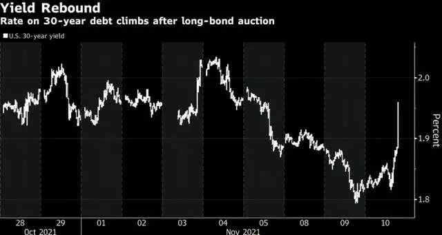BWC中文网财经团队经过计算发现,11月17日,美国10年期国债收益率升至1.634%,经10月通胀率(6.2%)调整后,10年期美债的实际利率为负4.566%,且负值区间已持续42周,这在美国债券发行史中是很罕见的,很明显,这是美国开启无底线货币政策后的结果,每次爆发新的危机时,美财政部和美联储的解决方案就是印钱、借债和花费更多的钱,这也使得最近二周以来美债发行需要疲软,吸引力下降,美债市场遍地地雷,投资者损失不小。