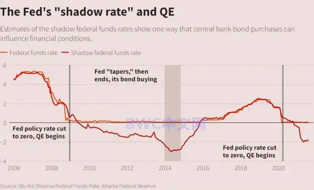 虽然,由于美国经济的持续增长和金融资产泡沫化,一些分析师也不再预测美国会主动采取负利率的可能,但有分析认为,在不可知因素突然中断经济复苏预期下,美联储可能在未来某个时候立即改变主意,从而支持负利率,因为,美联储已经在零利率水平待了很长时间,正如路透社查测到数据显示,目前,美元实际影子利率处于负值区间(具体数据趋势请参考下图)。