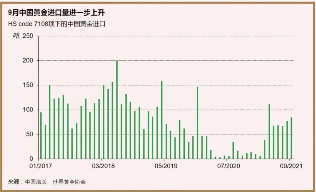 这也使得中国黄金进口量也出现显著回升,报告显示,第三季度中国黄金进口总量达228吨,同比增加171吨,同比大涨300%,数据显示,9月份中国的黄金进口量为85吨,8月进口量为76.9吨,较7月增加10.3吨,这也使得中国在2021年3月至9月的总进口量达到513吨。
