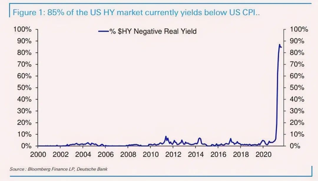 因为,美国长期将利率保持在零水平,且通胀维持在6%以上的高位,导致美债收益率扣除月度通胀后连续27周出现负收益,据德银高级分析师吉姆·里德 (Jim Reid) 的报告,目前,美国债券市场中有85%的高收益债券实际收益率为负值,低于当前的通胀率。