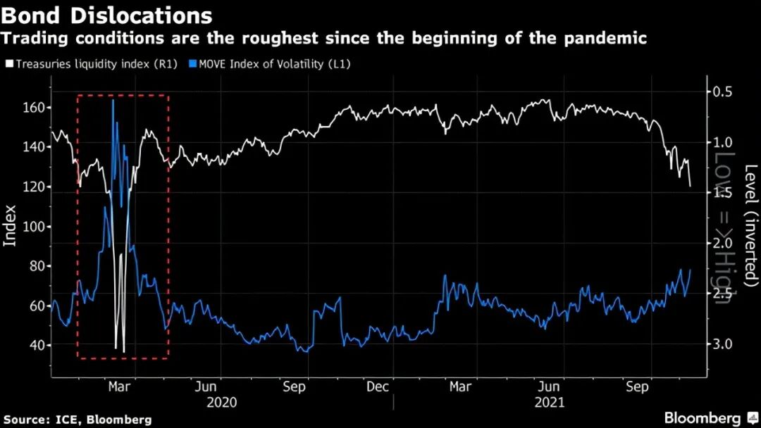 据彭博社在11月12日监测到的彭博美国国家证券流动性指数显示,美债目前的交易状况为2020年3月以来最糟,美国国债市场遍布地雷,截止11月16日的五周内,流出规模升至157亿美元。