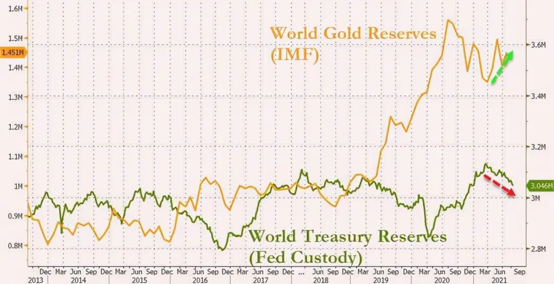 正是这些背景下,一些聪明的国际资金已经开始从美国资产市场中转移出来,这些资金纷纷涌入在通胀上升情况下会有上佳表现的战略资产,比如黄金,下面这张由世界黄金协会和IMF提供的最新数据所示,最近几个月从美国债券到黄金的置换趋势仍在继续,而这背后的核心逻辑原因很简单。