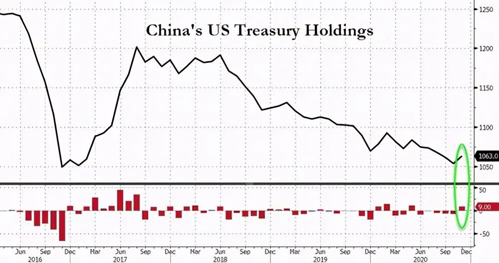其中,在此期间,报告数据显示,虽然11月中国净购买了90亿美元的美债,使得持美债仓位增至1.06万亿美元,我们注意到,这是中国在去年10月份之后的首次增持,但在2020年6月至10月,中国曾在5个月内连续累计减持297亿美债,持仓量降到四年(2017年1月)以来最低水平。而在此之前的24个月内,中国持续累计抛售了约1663亿美债。