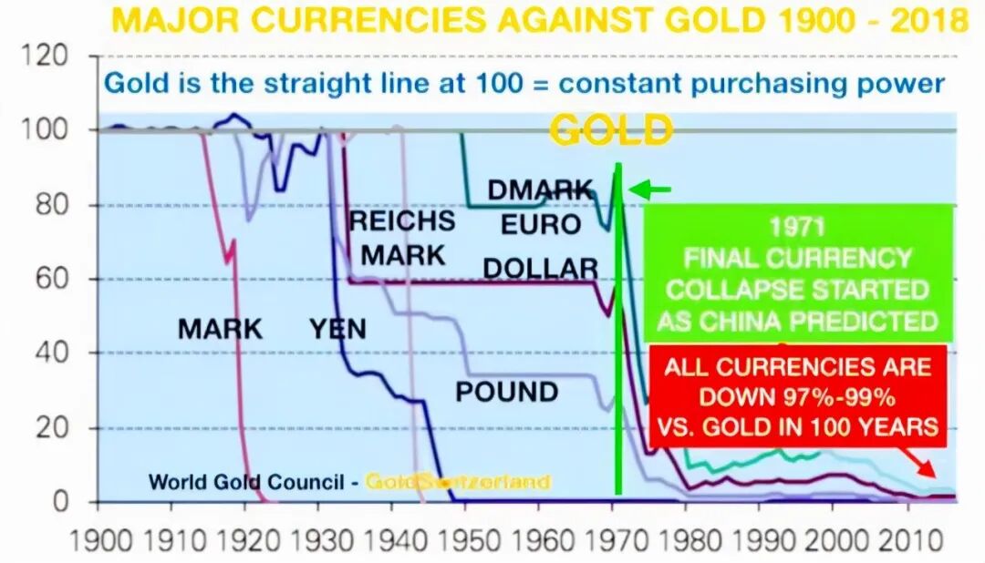 这些都说明黄金正在从货币历史视野的边缘回归,以对冲美元敞口风险,与此同时,中国、欧盟多国、俄罗斯和部分国家也正在对黄金的战略价值进行联合重估。正如下图所示,近一百年以来,美元对黄金下跌了97.3%的价值。