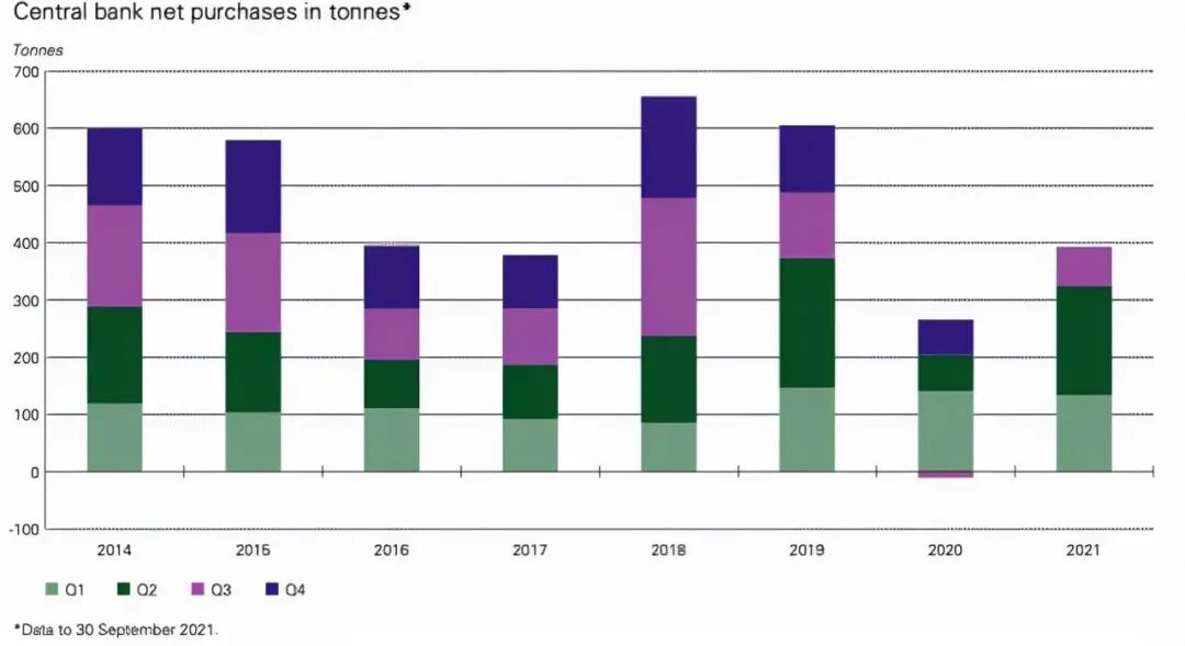 BWC中文网财经团队注意到,不仅中国市场的黄金需求和进口量在增加,WGC的报告还显示,2021年7至9月,全球央行净买入黄金也高达69吨,购买量比2020年同期明显增加。而从2017年1月至2021年9月)全球央行的黄金净购买量就已达2243吨(2021年前9个月,购金量393吨),创下美元与黄金脱钩那年以来的最高购买速度速录。