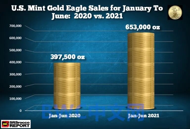 比如,最生动的一个例证就是现在越来越多的美国人也开始抢购金币和银币以应对通胀失控和保存财富等不确定性风险。据美国贵金属研究行业网Silverdoctor在11月25日更新的美国铸币局的数据报道,美国金币Gold Eagle的销售额自2021年以来截止11月15日,增长了惊人的79.98%,2020年同期销量为67.9万盎司,这也就是说,2021年仅用了不到11个月,美国人抢购金币的规模就相当于2019年全年总量的2.9倍。