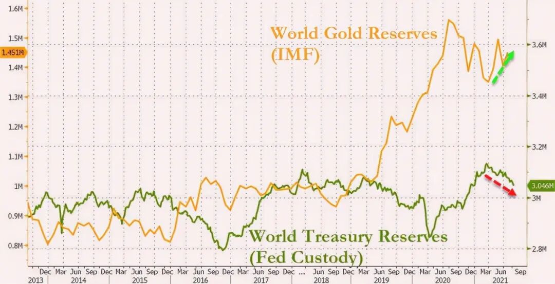 据世界黄金协会11月公布的最新报告,2021年前9个月,全球央行净买入黄金高达393吨,相比2020年购买量明显增加。而从2017年1月至2021年9月,全球央行的黄金净购买量更是高达2243吨,创下美元与黄金脱钩那年以来的最高购买速度速录。下面这张由世界黄金协会和IMF提供的最新数据所示,最近几个月从美国债券到黄金的置换趋势仍在继续。