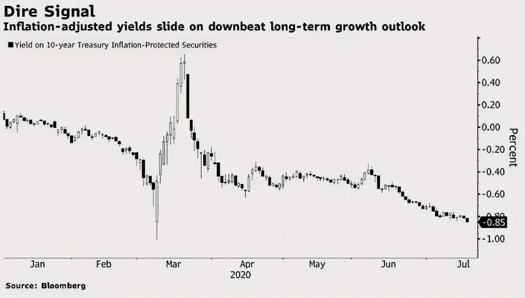 因为,现在美联储已经在零利率位置上停留了很长时间,正如下面这张路透社监测到图表所示,目前实际联邦基金利率显示为负,美联储控制的美元实际影子利率已经处于负值区间(具体数据趋势请参考下图)。