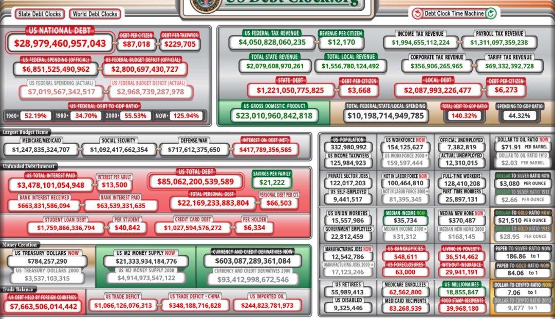 我们查询美联储和美财政部网站上公布的数据统计,在过去的78周内,M2相比2020年初快速增长了77.3%以上,M1更是增长了29.32%,这也就是说目前世界市场流通中的有四分之一还要多的美元现金是在此期间印出来的,这也使得美联储的资产负债表自去年初以来的4万亿扩大了232%至8.5万亿美元,截止11月29日,在下面这个像飞行仪表盘那样的美国联邦债务实时钟上显示的美国联邦已经有28.9万亿美元的债务赤字。