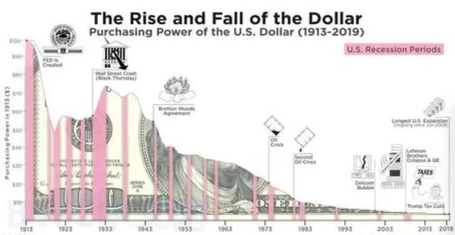 我们可以清晰地看到,美联储自1913年成立以来,美元几乎持续呈现出购买力下降的趋势,如下图。