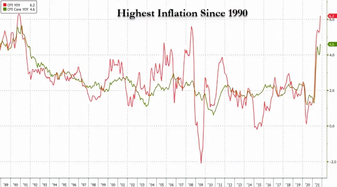 美国商务部在11月25日公布的10月核心PCE数据大涨5%,接近30年来的高点,超出市场预期,而这个被美联储最偏爱的通胀指标继续高于美联储设置目标的两倍以上,美国劳工部的10月消费者物价指数(CPI)也较上年同期上涨6.2%(且是连续四个月处于5%以上),创下31年以来的新高。