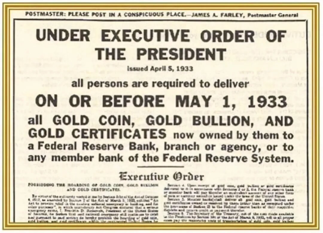 我们注意到,在1933年美国曾经发生过类似的事件,当时出于种种原因,时任美国总统罗斯福通过臭名昭著的行政命令没收了美国人民的黄金:公民被要求上交他们的金币,作为回报,他们将在银行获得一笔存款(具体细节请参考下图)。