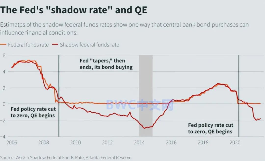 因为,美联储已经把利率降至接近零的水平很长时间,甚至在三周前,联邦基金期货的市场数据表示,从2021年10月开始,美联储基准利率可能会跌至略低于零的水平。正如路透社检测到的数据显示,目前,实际影子利率处于负值区间(具体数据趋势请参考下图)。