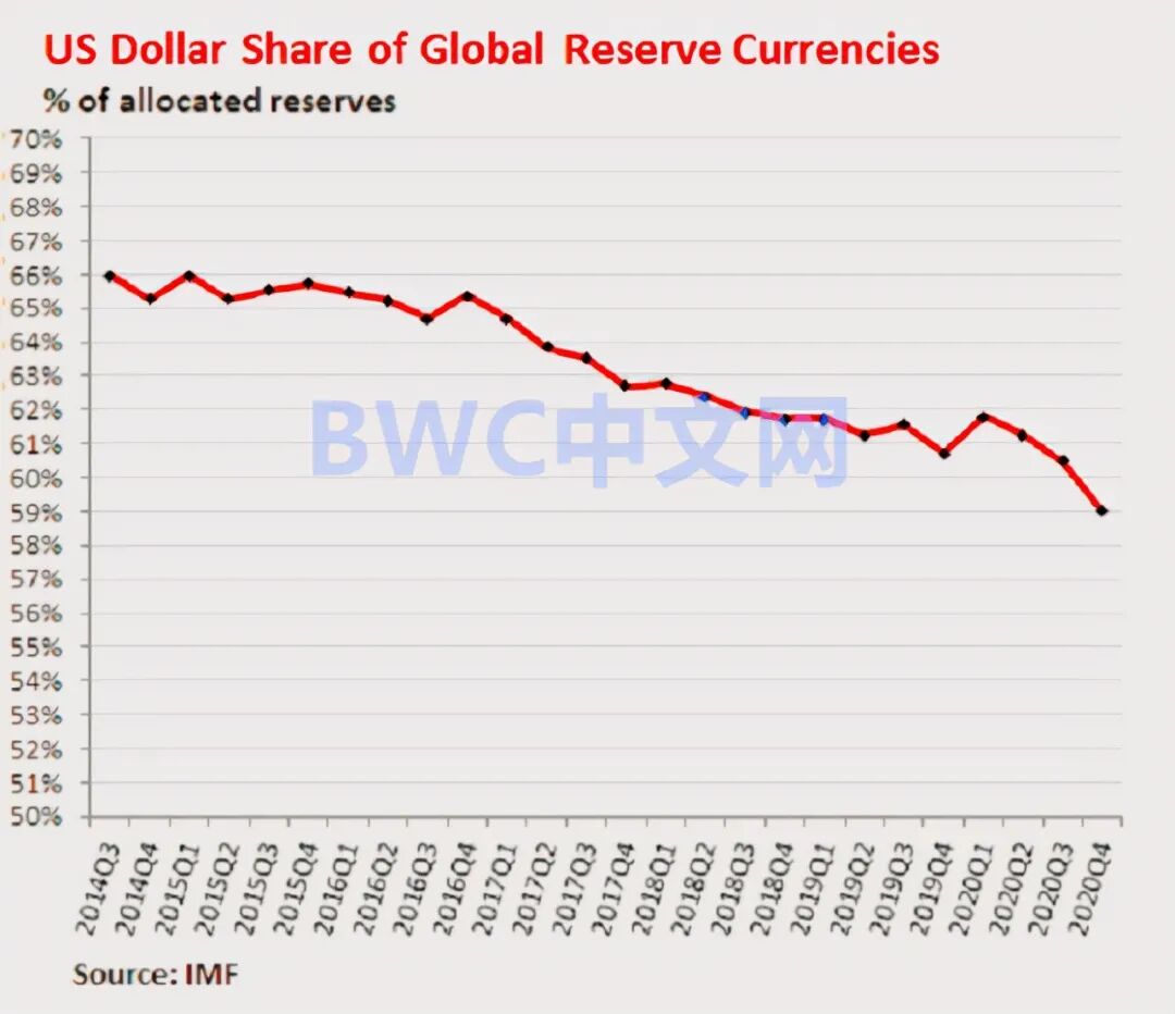 据国际货币基金组织(IMF)在10月公布的全球国际储备数据显示,2021年第二季度美元在各国外储中的份额占比意外下降至25年来最低值59.3%,值得一提的是,2000年时该比例还高达73%,如果按照这个趋势,我们很快会看到这个数字接近50%,因为预期新兴市场汇率制度未来的变化可能会触发国际货币秩序的重大转变。同时,欧盟、俄和新兴市场国家也正在对黄金的战略经济价值进行联合重估。显然,美联储的超级宽松政策会透支美元的信贷,并促发全球寻找美元替代方案。
